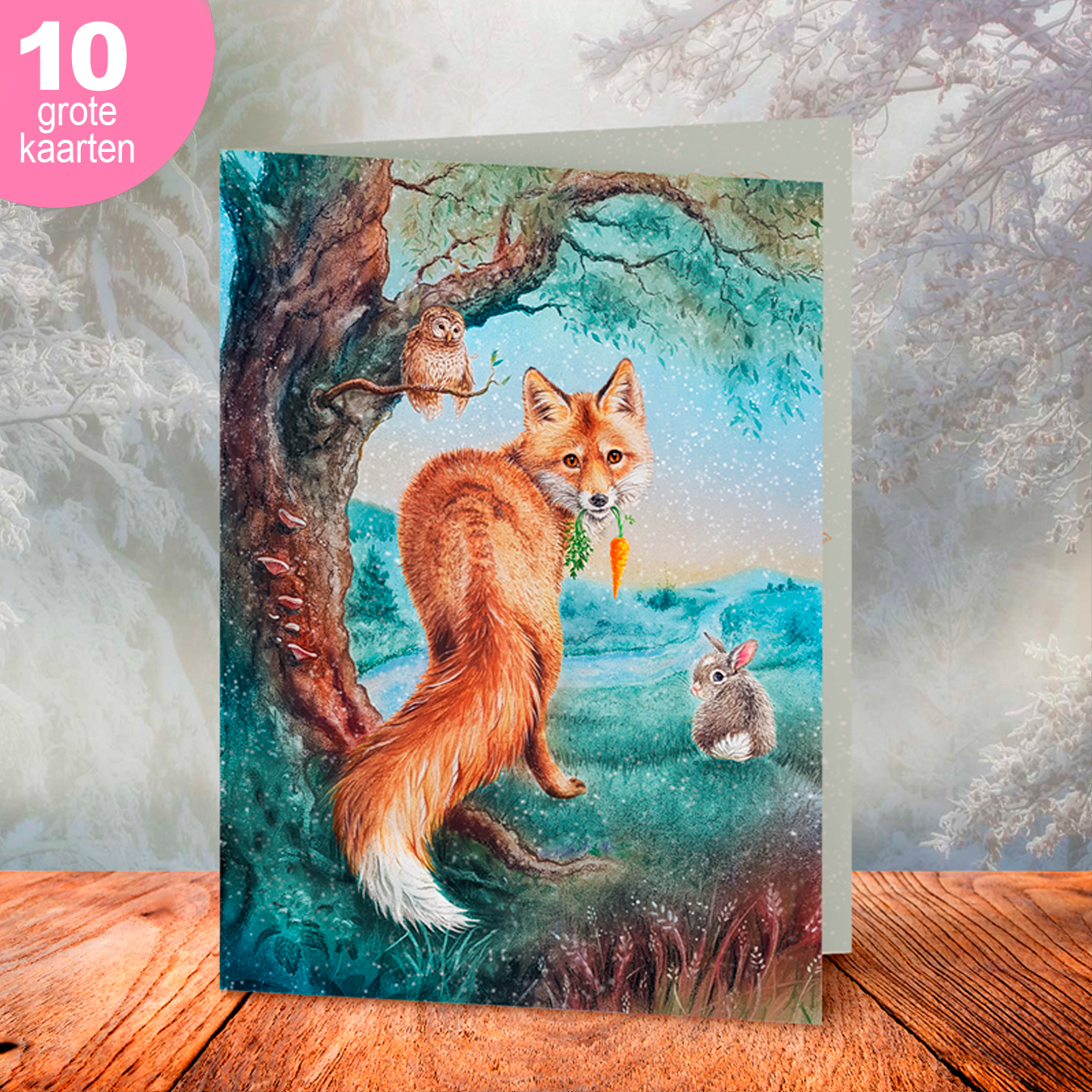 Kaartenset van 10 grote A5 kaarten, te versturen met 1 kerstzegel. De kaarten zijn CO2-neutraal gedrukt op papier van landbouwafval. Er zijn dus geen bomen voor gekapt. Het formaat van de kaarten is A5 (14,8 cm x 21 cm) en ze zijn ook aan de binnenkant bedrukt. Er zitten gerecyclede enveloppen bij die gemaakt zijn van oude landkaarten.