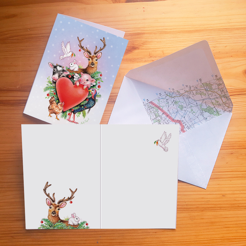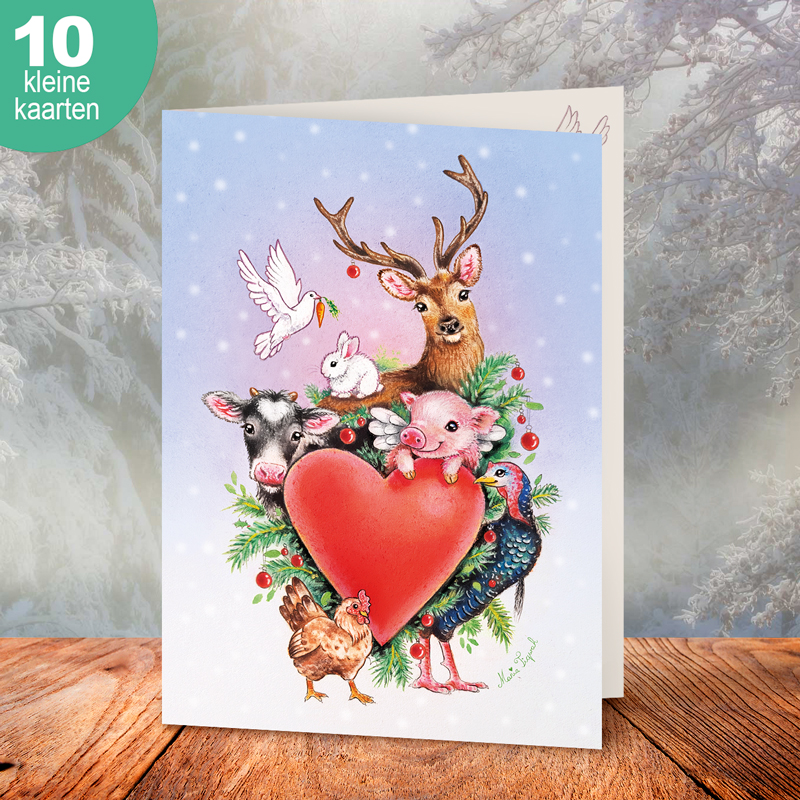 Set van 10 kleine A6 kerstkaarten. De kaarten zijn CO2 neutraal gedrukt op papier gemaakt van landbouwafval. Met 10 gerecyclede enveloppen, gemaakt van oude landkaarten.