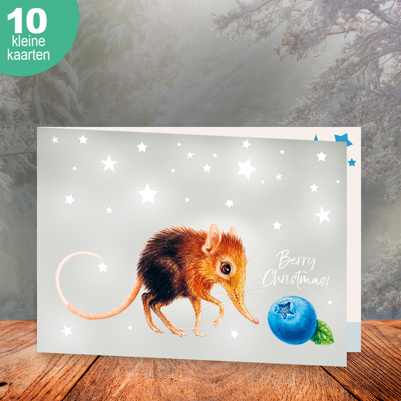 Set van 10 kleine A6 kerstkaarten. De kaarten zijn CO2 neutraal gedrukt op papier gemaakt van landbouwafval. Met 10 gerecyclede enveloppen, gemaakt van oude landkaarten.